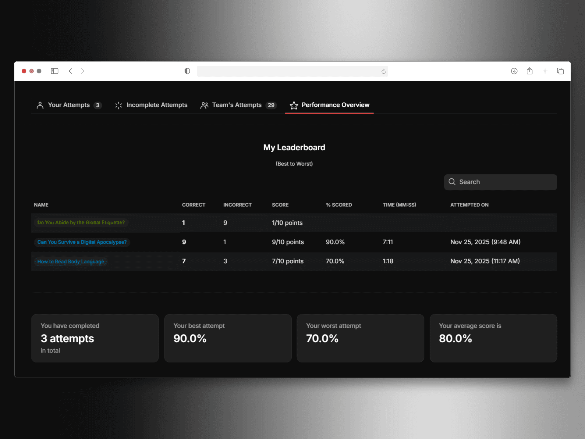 Performance Analytics Dashboard Track quiz results and user performance in real-time. Identify knowledge gaps and see where your team excels with clear, actionable data.
